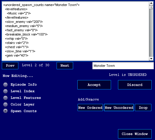 There are two placement selection windows: the main item set and the extended item set. The main item set has, for the most part, all the item types used in the original Kroz games. The extended item set, accessible by clicking the "More" button, contains new items used only in Cruz.