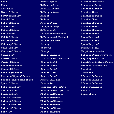 Valid types are the inventory items (GEM, WHIP, TELEPORT_SCROLL, KEY, POWER_RING) as well as SCORE, which gives points.