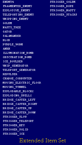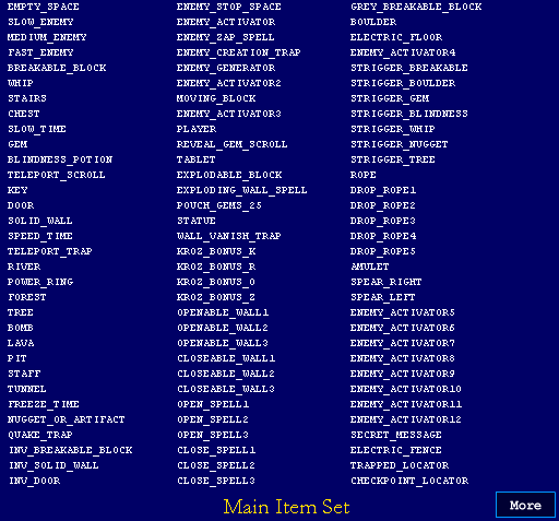 There are two placement selection windows: the main item set and the extended item set. The main item set has, for the most part, all the item types used in the original Kroz games. The extended item set, accessible by clicking the "More" button, contains new items used only in Cruz.